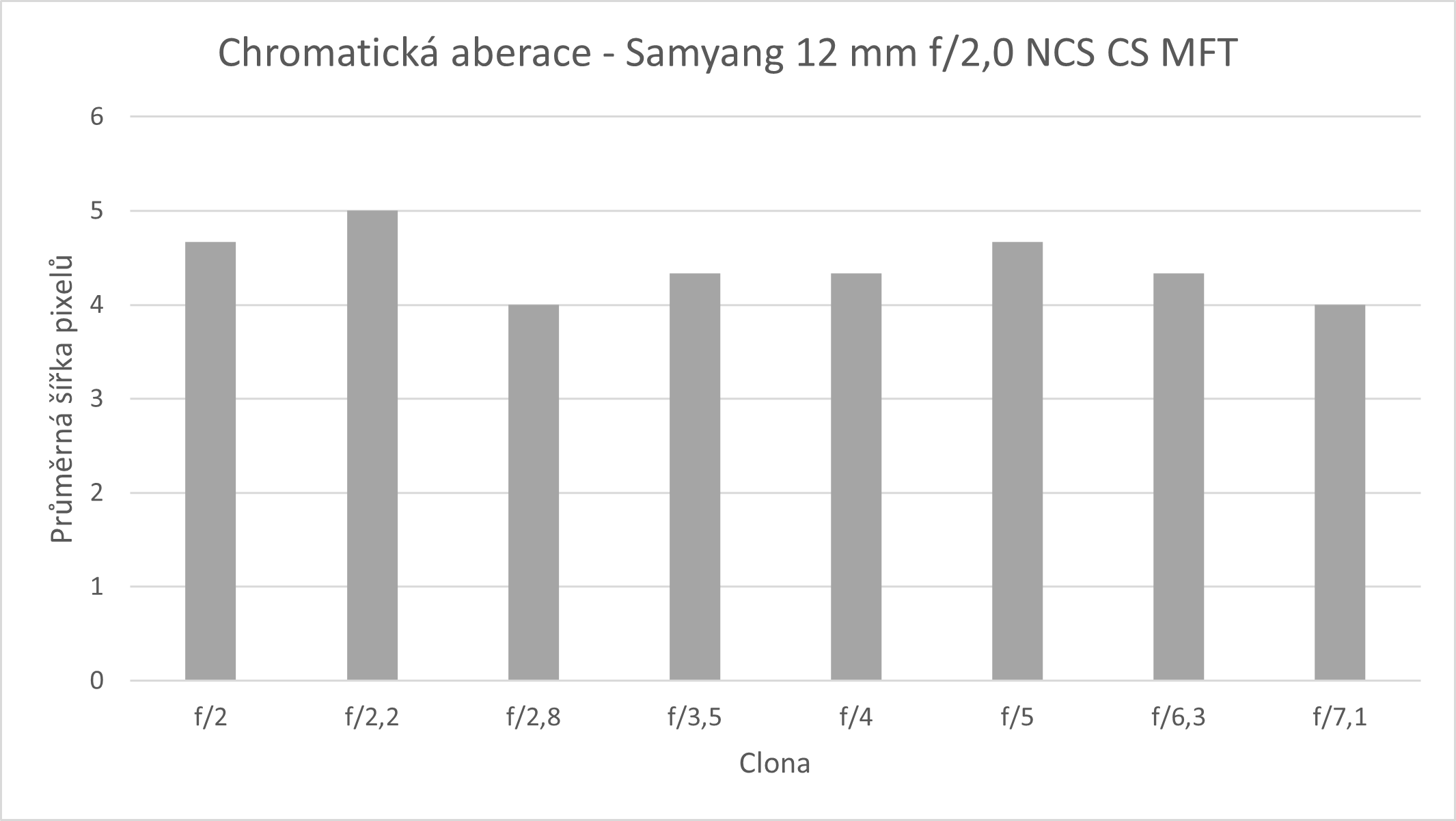 Aberace na tomto objektivu je patrná již na první pohled. Nejvyšší hodnoty 5 px dosahuje při cloně f/2,2. při ostatních clonových číslech je stále vysoká, nejnižší hodnota 4 px byla naměřena při cloných f/2,8 a f/7,1. Ve středu snímku se aberace také vyskytuje, ale již není tak výrazná, nejvyšší hodnotu 1,5 px dosahuje při cloně f/2.