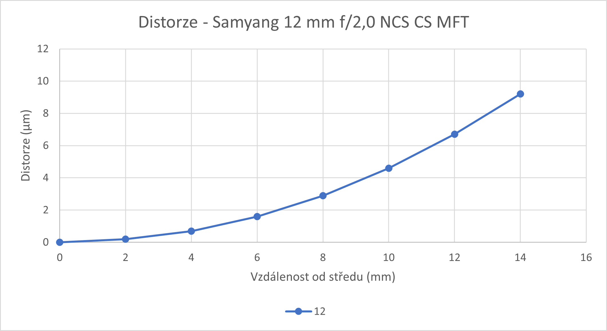 U tohoto širokoúhlého objektivu s pevnou ohniskovou vzdáleností je křivka velmi podobná, jako u předchozí Sigmy. Objektiv má distorzi soudkovitého tvaru. Nejvyšší hodnota ve vzdálenosti 14 milimetrů je 9,2 mikrometrů.