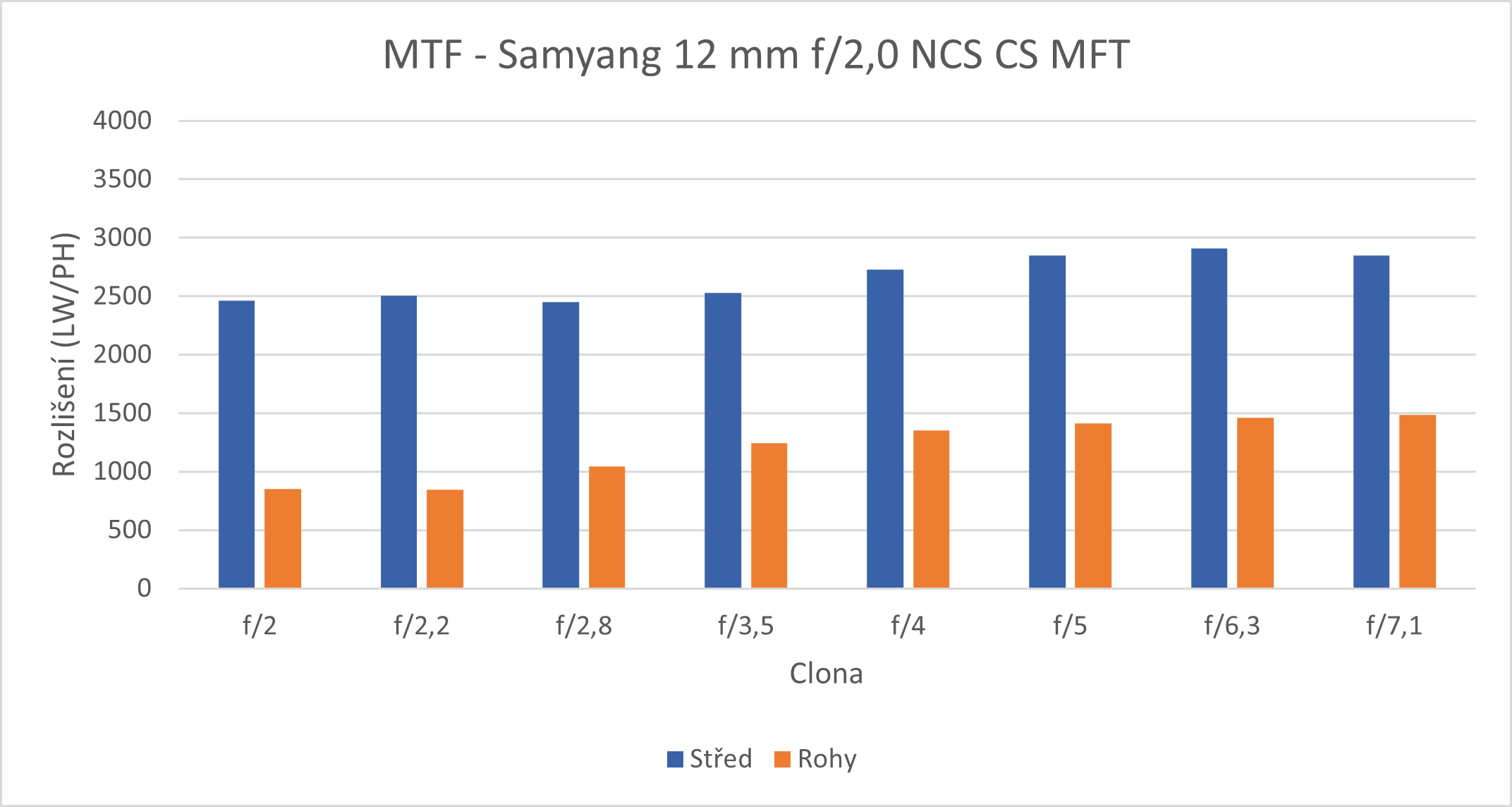 Objektiv dosahuje nejvyšší ostrosti uprostřed snímku při cloně f/6,3, při ostatních clonových číslech je ostrost jen o něco málo nižší. Na rozích snímku je objektiv nejostřejší až při zaclonění na f/7,1. Nejnižší hodnoty byly naměřeny na cloně f/2.