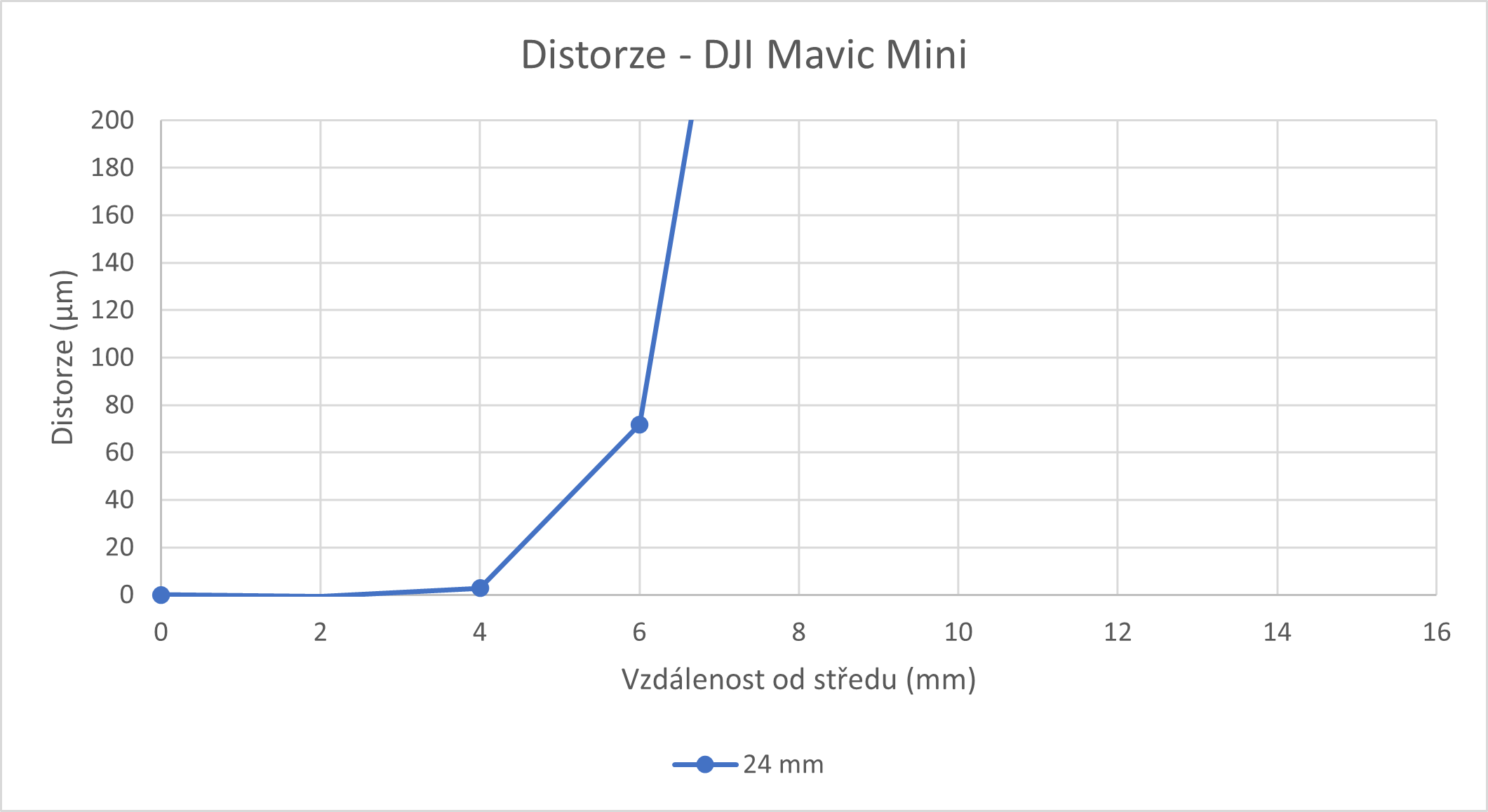 Křivka tohoto dronu dosahuje extrémních hodnot, proto se nedá test této kamery brát relevantně a bylo by vhodné pokus zopakovat. Maximální hodnota, která se na křivce vyskytuje je 14922 mikrometrů ve vzdálenosti 14 mm. Ve vzdálenosti 2 mm je hodnota -0,5 mikrometrů. Bohužel ani při opakování testu tohoto zařízení na jiném monitoru nebylo dosaženo lepších výsledků.