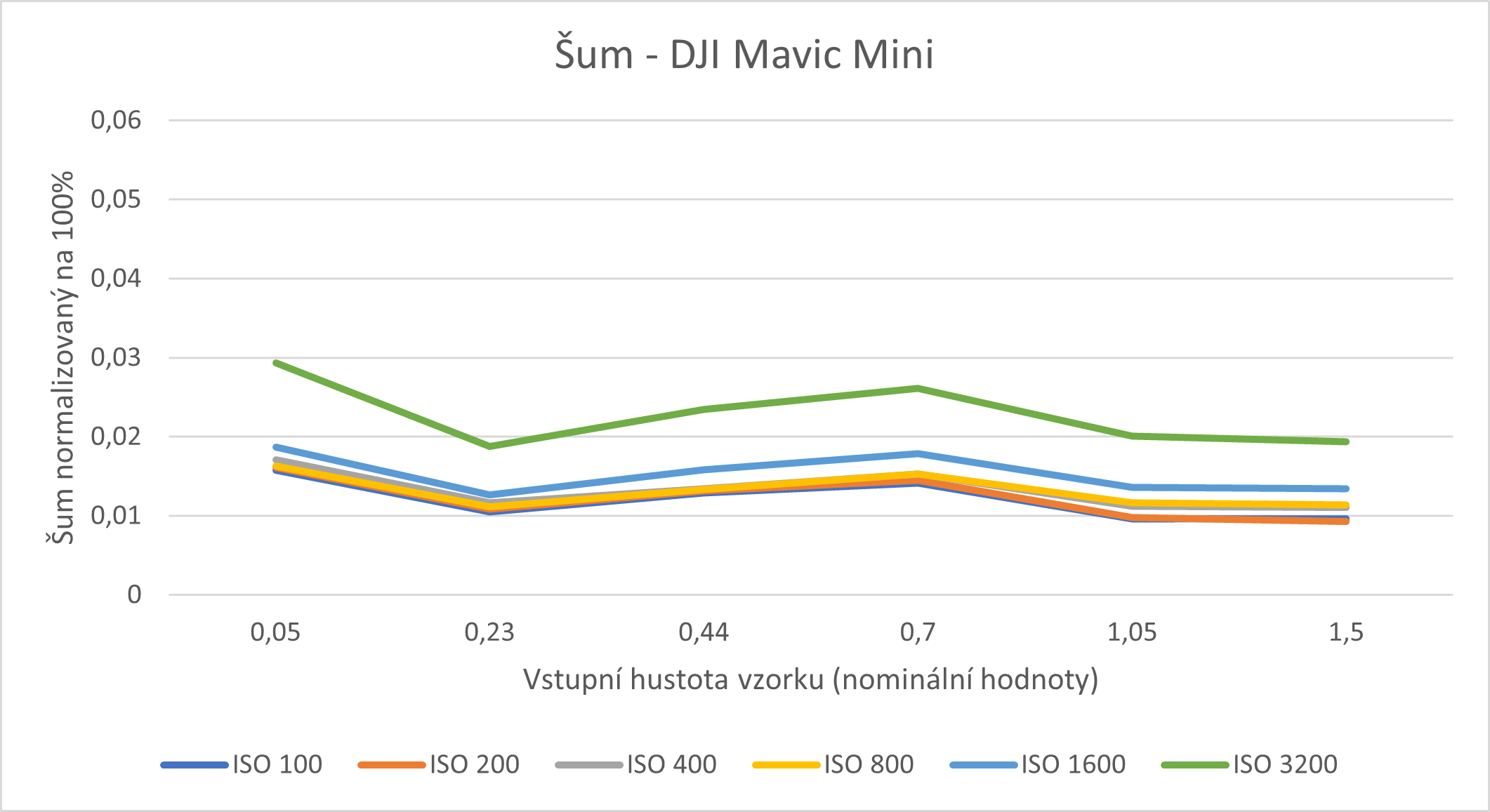 U tohoto dronu nelze pořizovat snímky v RAW formátu, proto na testovaných fotografiích již byly použity korekce a výsledky mohou být zkresleny. Od hodnoty ISO 100 až po ISO 800 se křivky překrývají, téměř splývají do jedné. První viditelný odskok je při ISO 1600. Při použití ISO 3200 je odskok ještě větší, ale úroveň šumu v obraze dosahuje stále velmi nízkých hodnot.