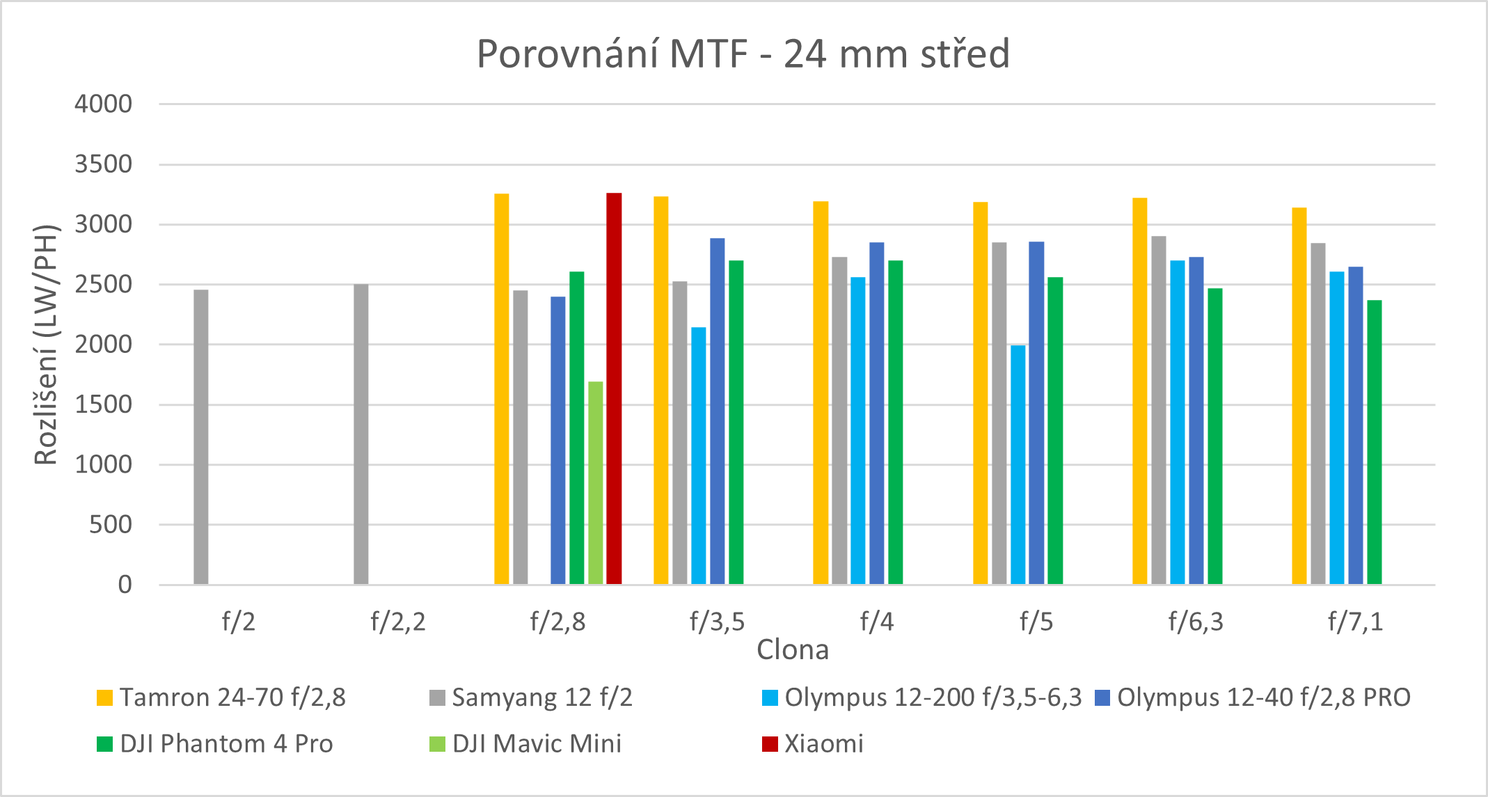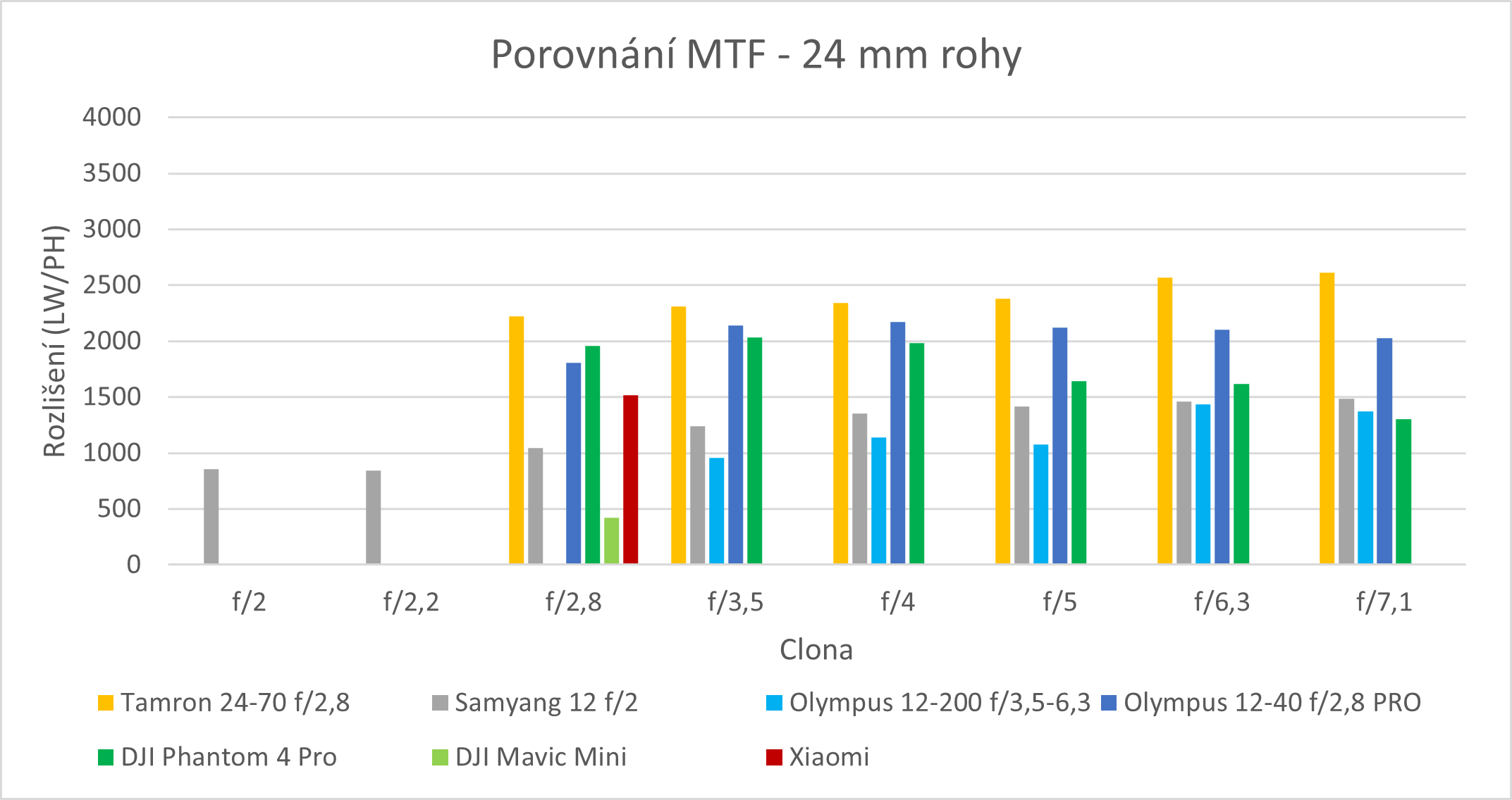Na ohnisku 24 mm dosahuje většina objektivů nejvyšších hodnot na středu snímku při použití clony f/4. Objektiv Tamron AF 24-70 mm f/2.8 SP Di USD VC je při všech clonových číslech nejostřejší oproti ostatním testovaným zařízením. Mobilní telefon Xiaomi dosahuje také velmi vysokých hodnot. Nejméně ostrý je ve středu snímku dron DJI Mavic Mini a na cloně f/5 Olympus M.Zuiko Digital ED 12-200 mm f/3,5-6,3. Na rozích snímku jsou hodnoty všech zařízení znatelně nižší. Nejvyšších hodnot opět dosahuje objektiv Tamron AF 24-70 mm f/2.8 SP Di USD VC, hned za ním je nejostřejší na rozích objektiv Olympus M.Zuiko Digital ED 12-40 mm f/2,8 Pro. Ostrost na rozích roste se zvyšující se clonou u Tamronu, u ostatních zařízení klesá.