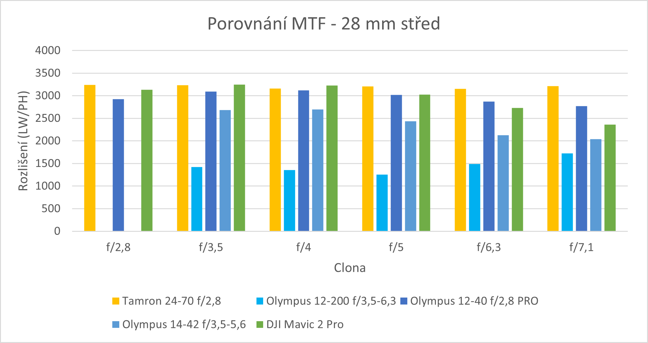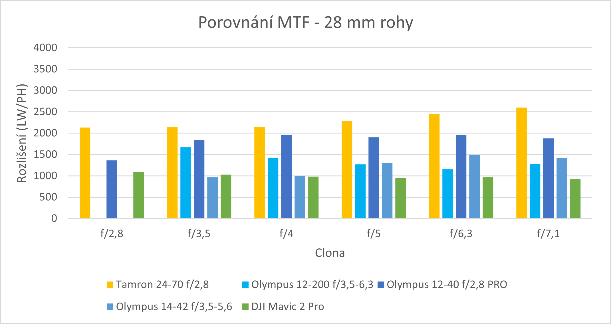 Při použití ohniska 28 mm dosahují objektivy ve většině případů vyšších hodnot. Na středu snímku se při použití nízkých clonových čísel vyrovnají objektiv Tamron AF 24-70 mm f/2.8 SP Di USD VC a dron DJI Mavic 2 Pro. Hned třetí je objektiv Olympus M.Zuiko Digital ED 12-40 mm f/2,8 Pro, který je od clony f/6,3 ostřejší než zmíněný dron. Nejméně ostrý je objektiv Olympus M.Zuiko Digital ED 12-200 mm f/3,5-6,3 a to při všech testovaných clonách. Na rozích jsou hodnoty znatelně nižší. Největší rozdíl mezi objektivy je při cloně f/7,1 kde je Tamron nejostřejší. Dron Mavic 2 Pro dosahuje na rozích nejnižších hodnot.