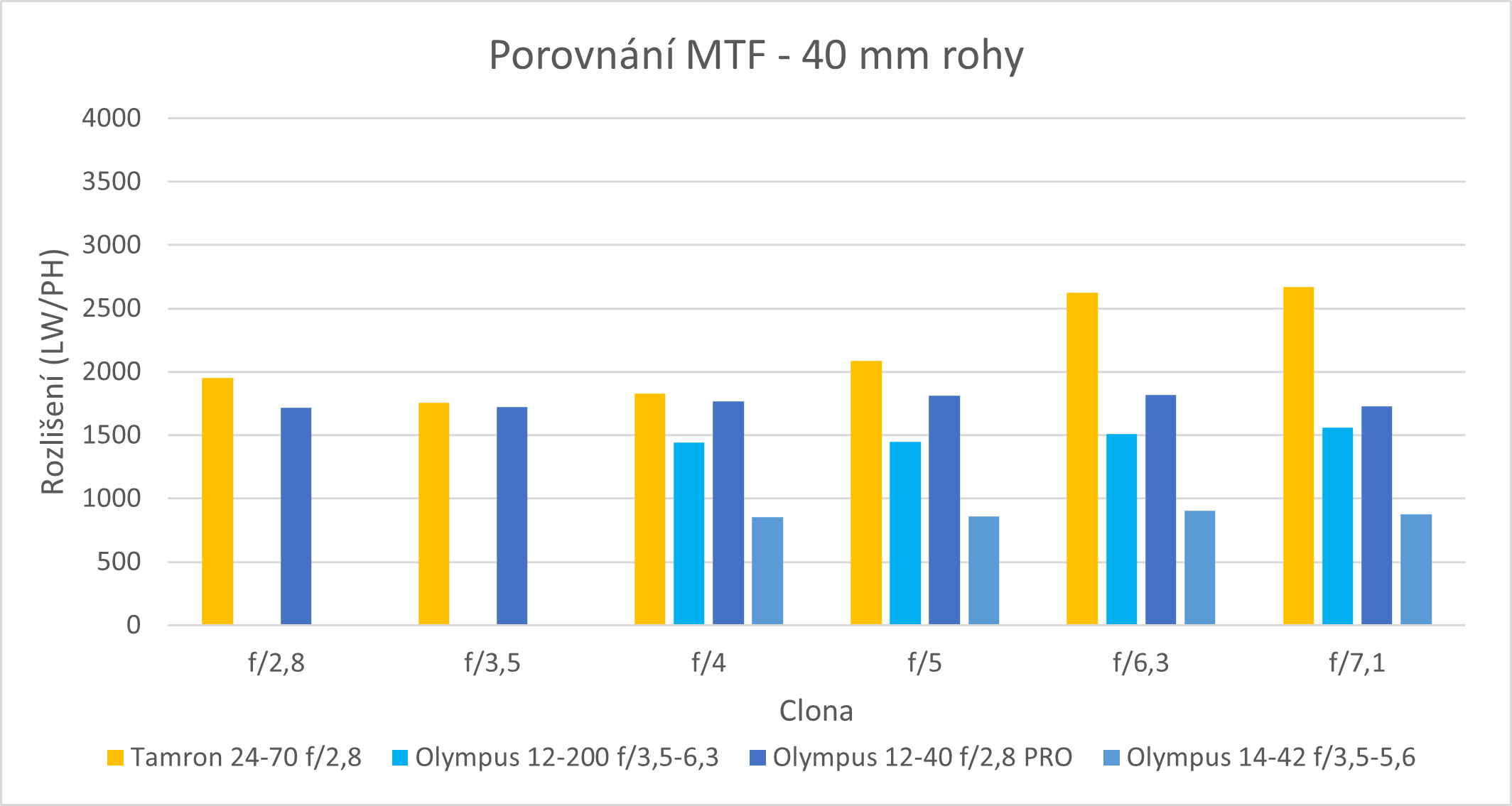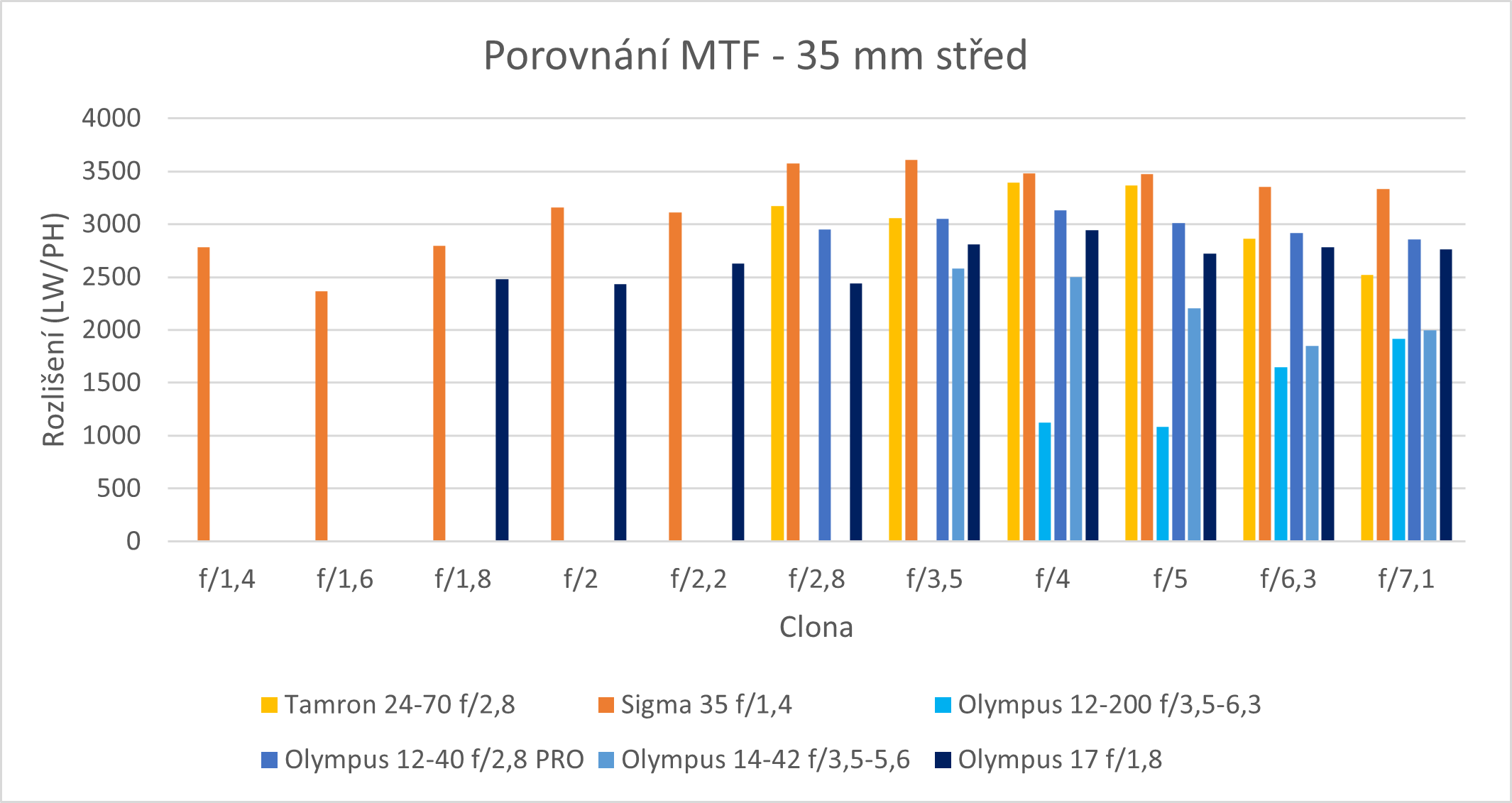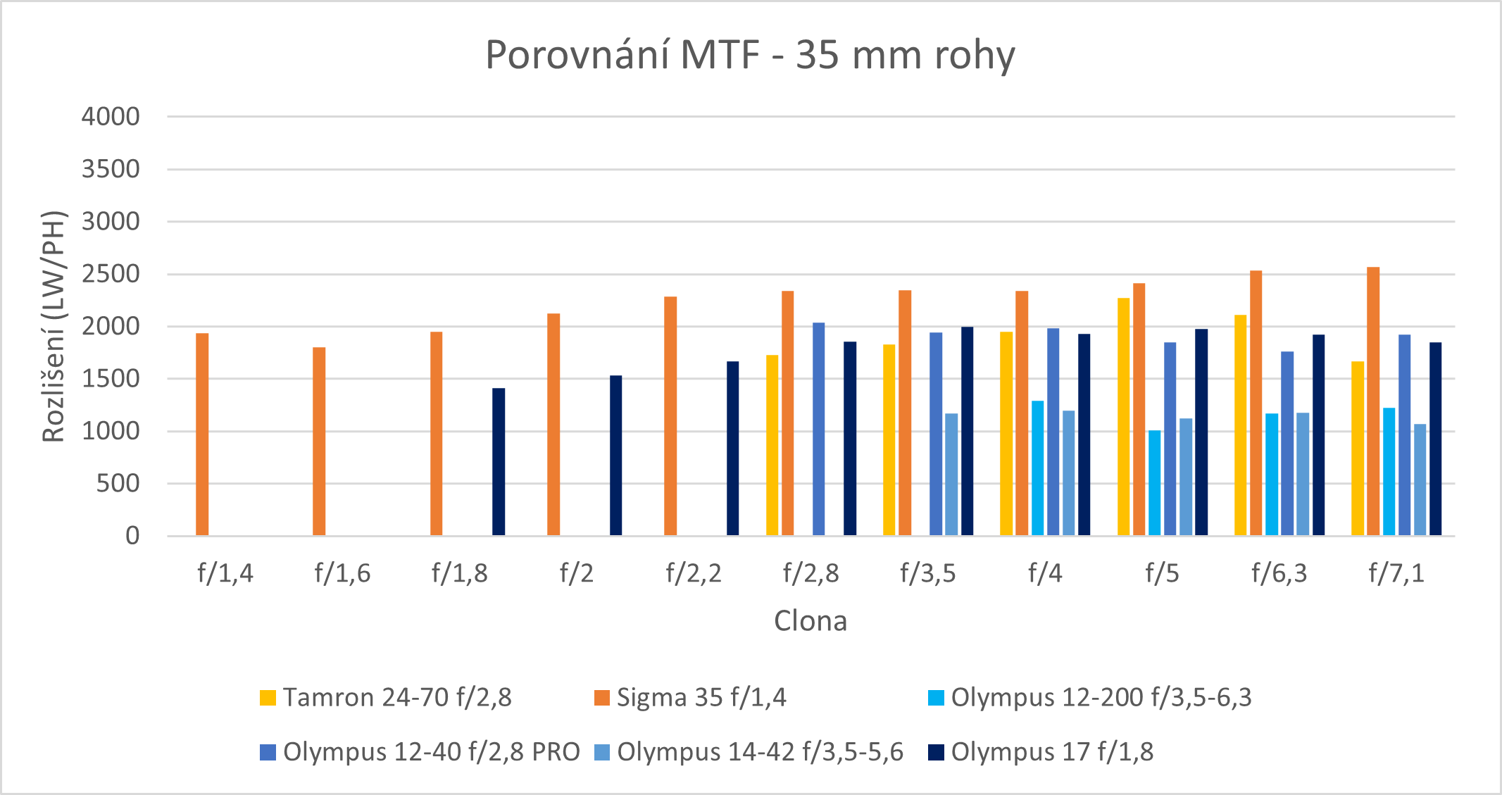 Na středu snímku na ohnisku 35 mm je při všech testovaných clonách nejostřejší objektiv Sigma Art 35 mm f/1,4, který dosahuje nejvyšších hodnot při cloně f/3,5. Při tomto nastavení je oproti ostatním objektivům lepší o 500 LW/PH. Na clonách f/4 a f/5 se mu vyrovná Tamron AF 24-70 mm f/2.8 SP Di USD VC. Nejnižší hodnoty byly naměřeny u objektivu Olympus M.Zuiko Digital ED 12-200 mm f/3,5-6,3. Na rozích snímku je Sigma nejostřejší při zaclonění na f/7,1. Nejméně ostré jsou objektivy Olympus M.Zuiko Digital ED 12-200 mm f/3,5-6,3 a Olympus M.Zuiko Digital ED 14-42 mm f/3,5-5,6 EZ Pancake.