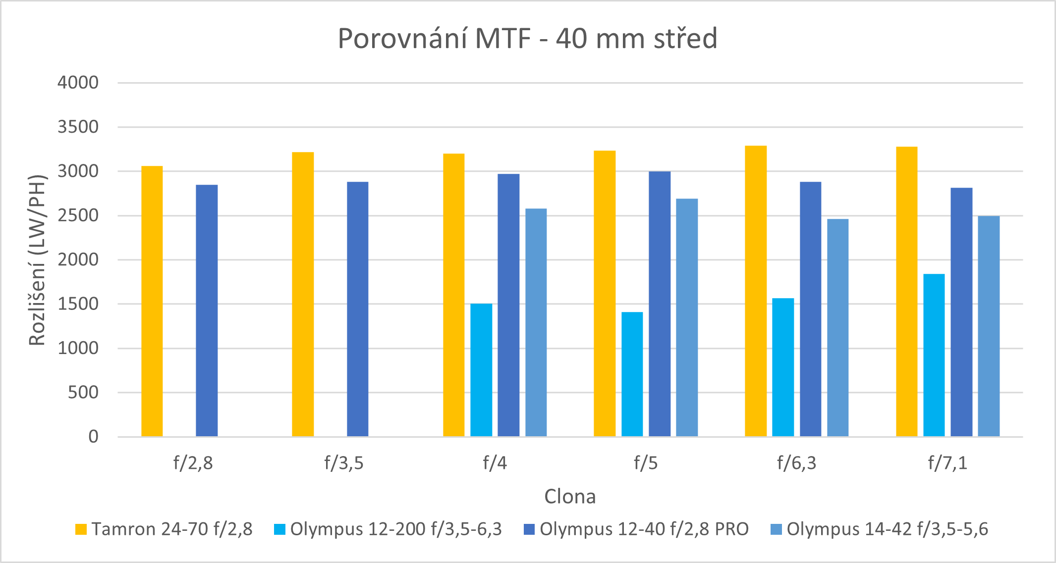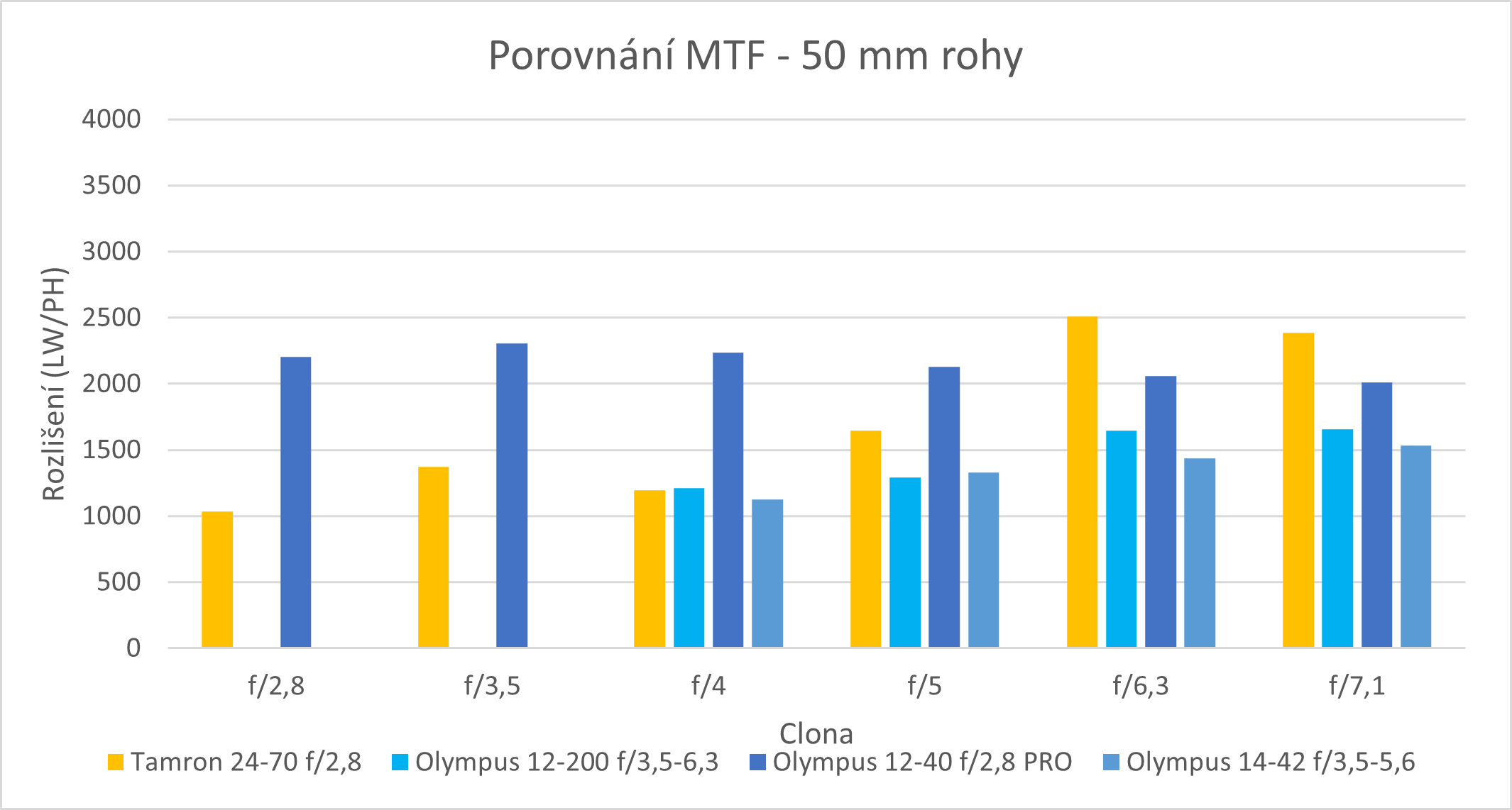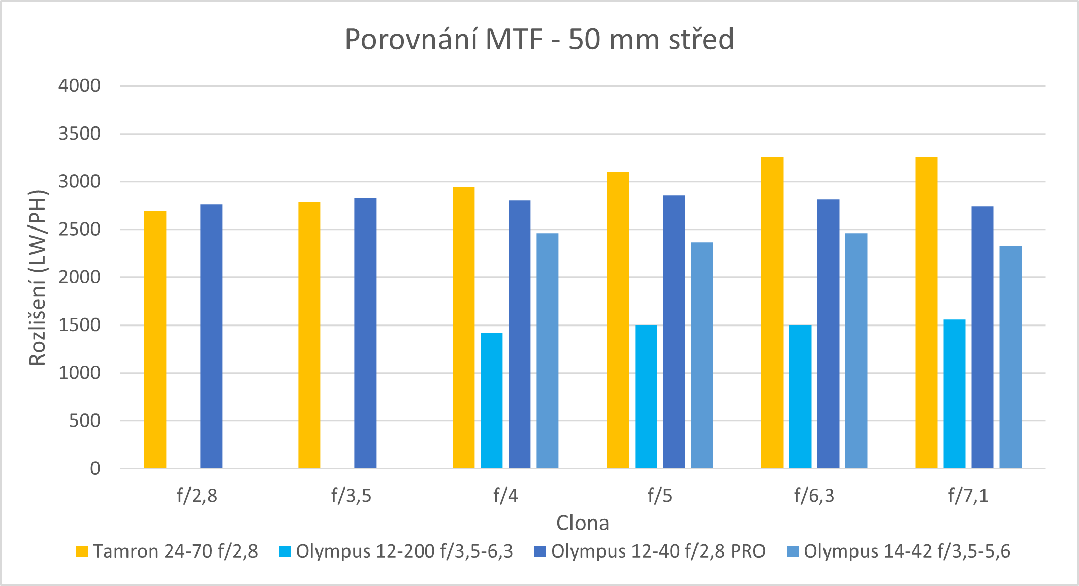 Na středu snímku na ohnisku 35 mm je při všech testovaných clonách nejostřejší objektiv Sigma Art 35 mm f/1,4, který dosahuje nejvyšších hodnot při cloně f/3,5. Při tomto nastavení je oproti ostatním objektivům lepší o 500 LW/PH. Na clonách f/4 a f/5 se mu vyrovná Tamron AF 24-70 mm f/2.8 SP Di USD VC. Nejnižší hodnoty byly naměřeny u objektivu Olympus M.Zuiko Digital ED 12-200 mm f/3,5-6,3. Na rozích snímku je Sigma nejostřejší při zaclonění na f/7,1. Nejméně ostré jsou objektivy Olympus M.Zuiko Digital ED 12-200 mm f/3,5-6,3 a Olympus M.Zuiko Digital ED 14-42 mm f/3,5-5,6 EZ Pancake.