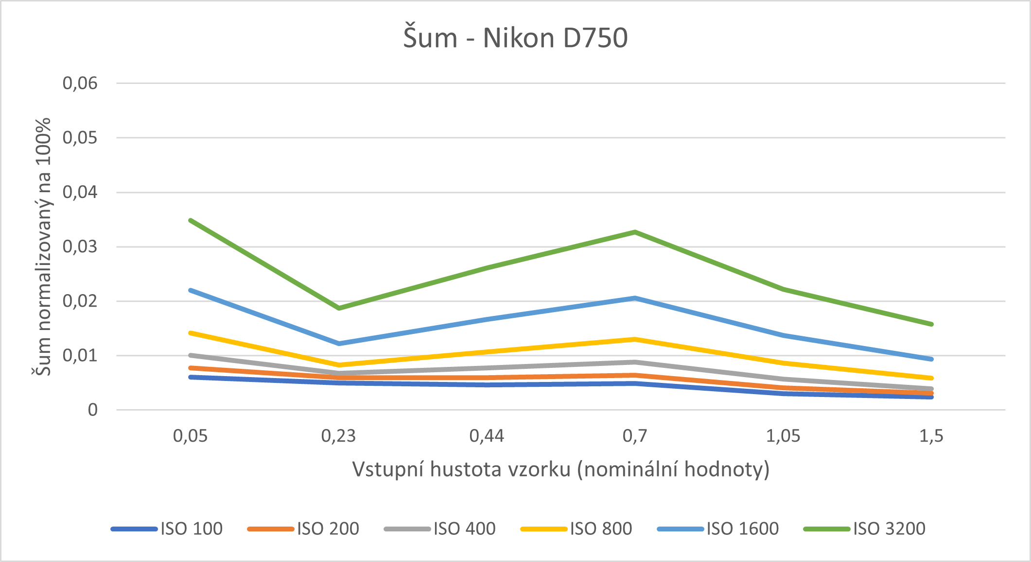 Fotoaparát s největším snímačem dosahuje velmi nízkých hodnot šumu. ISO 100, 200 a 400 se téměř překrývají a mají mírný průběh. Se zvyšujícím se ISO roste odchylka. Výrazný skok mezi křivkami nastává mezi hodnotami ISO 1600 a 3200. Nejvíce šumu se vyskytuje v bílém čtverci, nejméně v černém. Do hodnoty ISO 1600 bylo v obraze naměřeno velmi malé množství šumu.