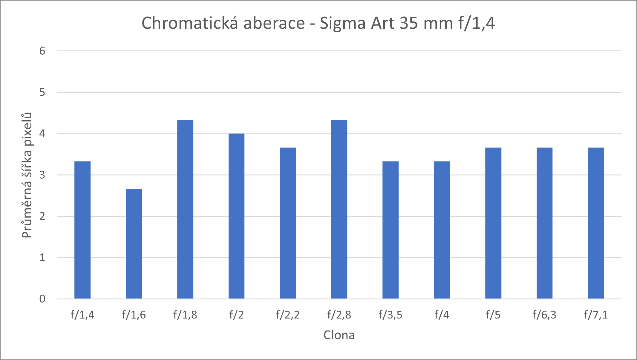 Tento objektiv je velmi náchylný k aberaci, a to na všech clonových číslech. Nejvyšší hodnoty 4,3 px jsou na clonách f/1,8 a f/2,8. nejnižší hodnota byla naměřena při cloně f/1,6. Podobně se tento objektiv chová i ve středu snímku, kde se aberace nejčastěji vyskytuje v délce 2 px.