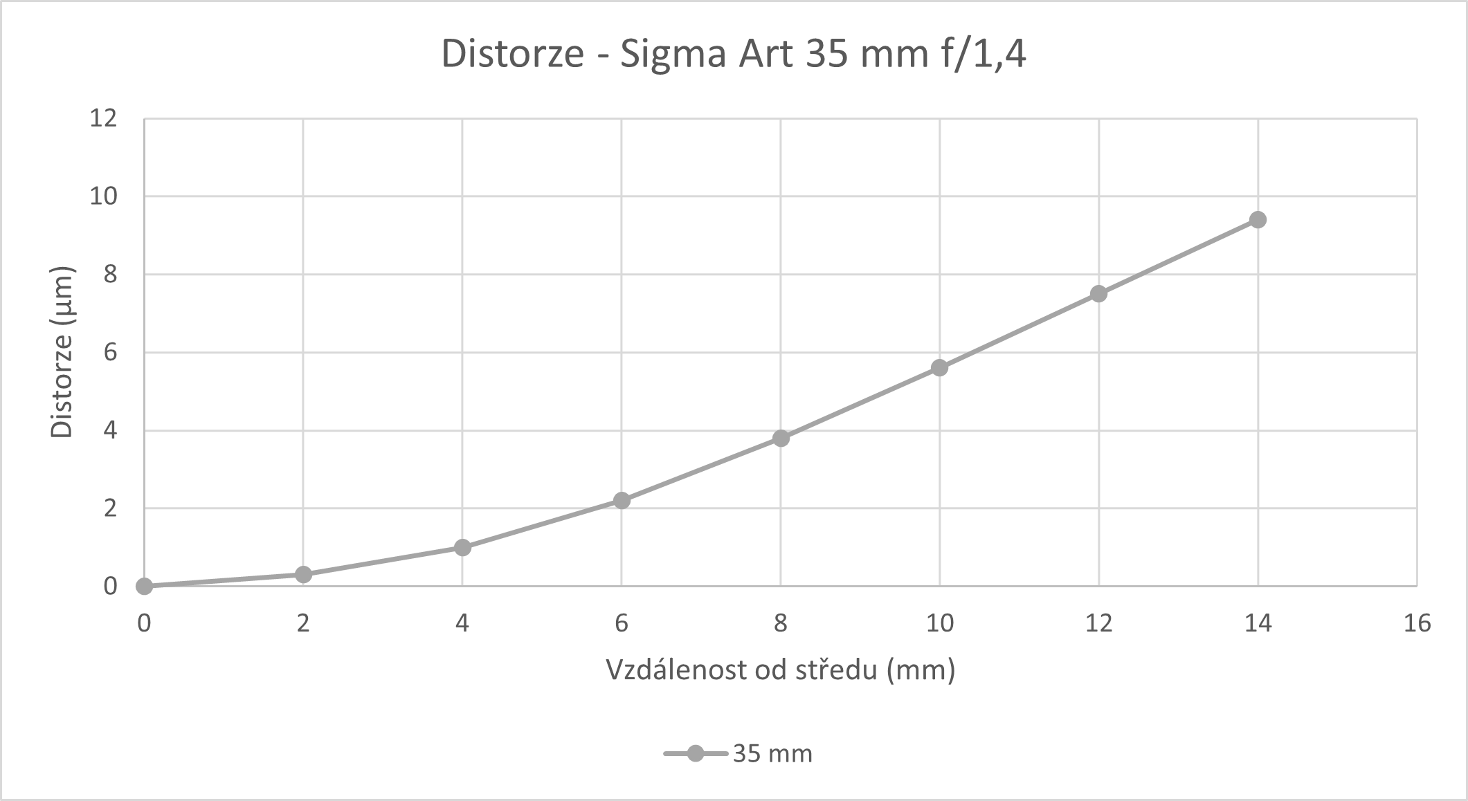 Tento objektiv má soudkovitý tvar distorze. Křivka vývoje značně stoupá již ve vzdálenosti 6 mm od nuly. V poslední měřené vzdálenosti dosahuje hodnoty 9,4 mikrometrů.