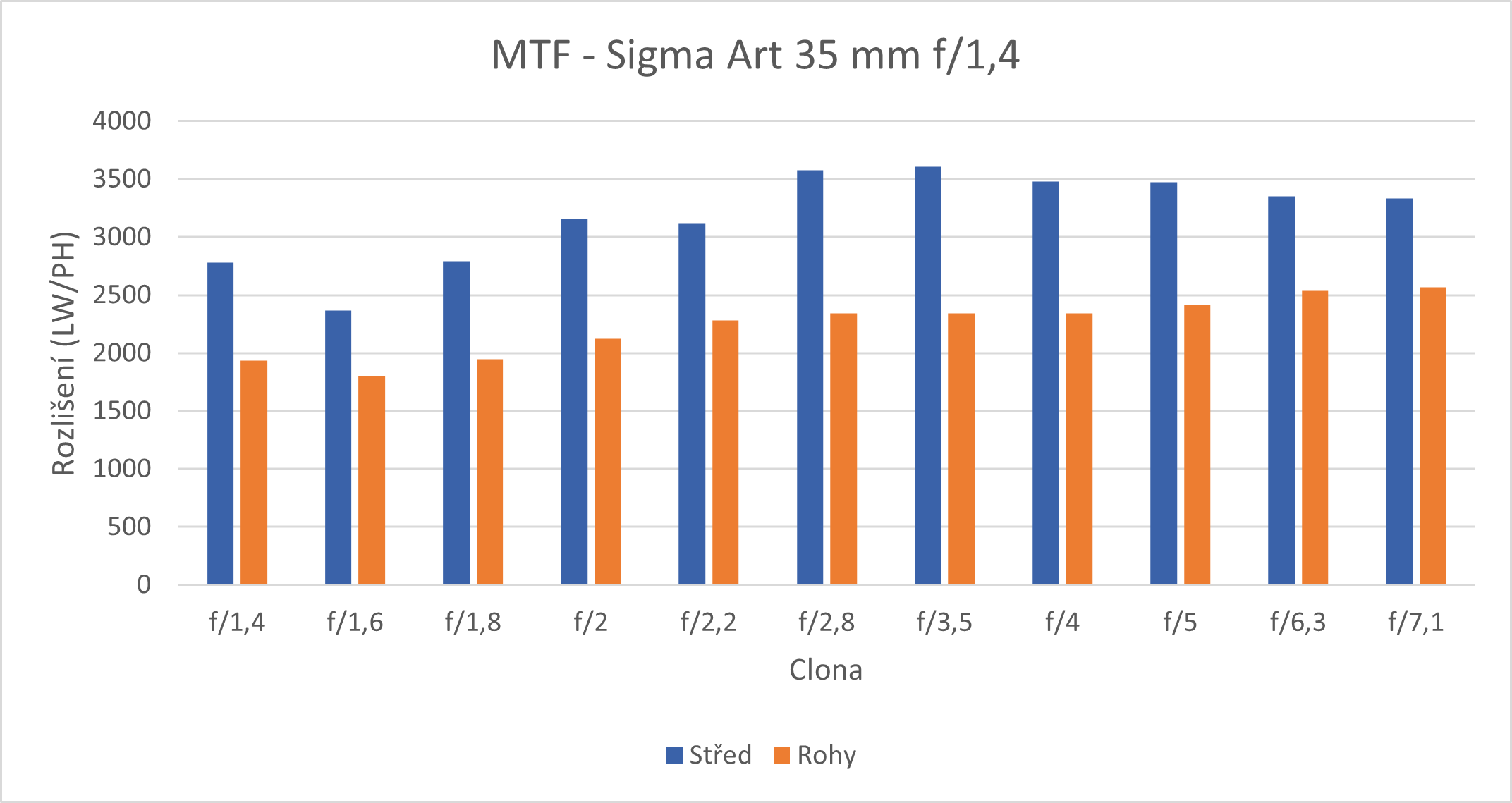 Charakteristika ostrosti u tohoto objektivu je proměnlivá. Na nastavené cloně f1,4 je ostrost středu snímku vyšší, než při použití f/1,6. Na této hodnotě je objektiv nejméně ostrý. Nejvyšší ostrosti dosahuje objektiv při cloně f/3,5 a to hodnoty 3605 LW/PH. Od této hodnoty clony dál, až po testovanou f/7,1 ostrost lehce klesá. Na rozích je charakteristika podobná, nejvyšší ostrost byla naměřena při cloně f/7,1.