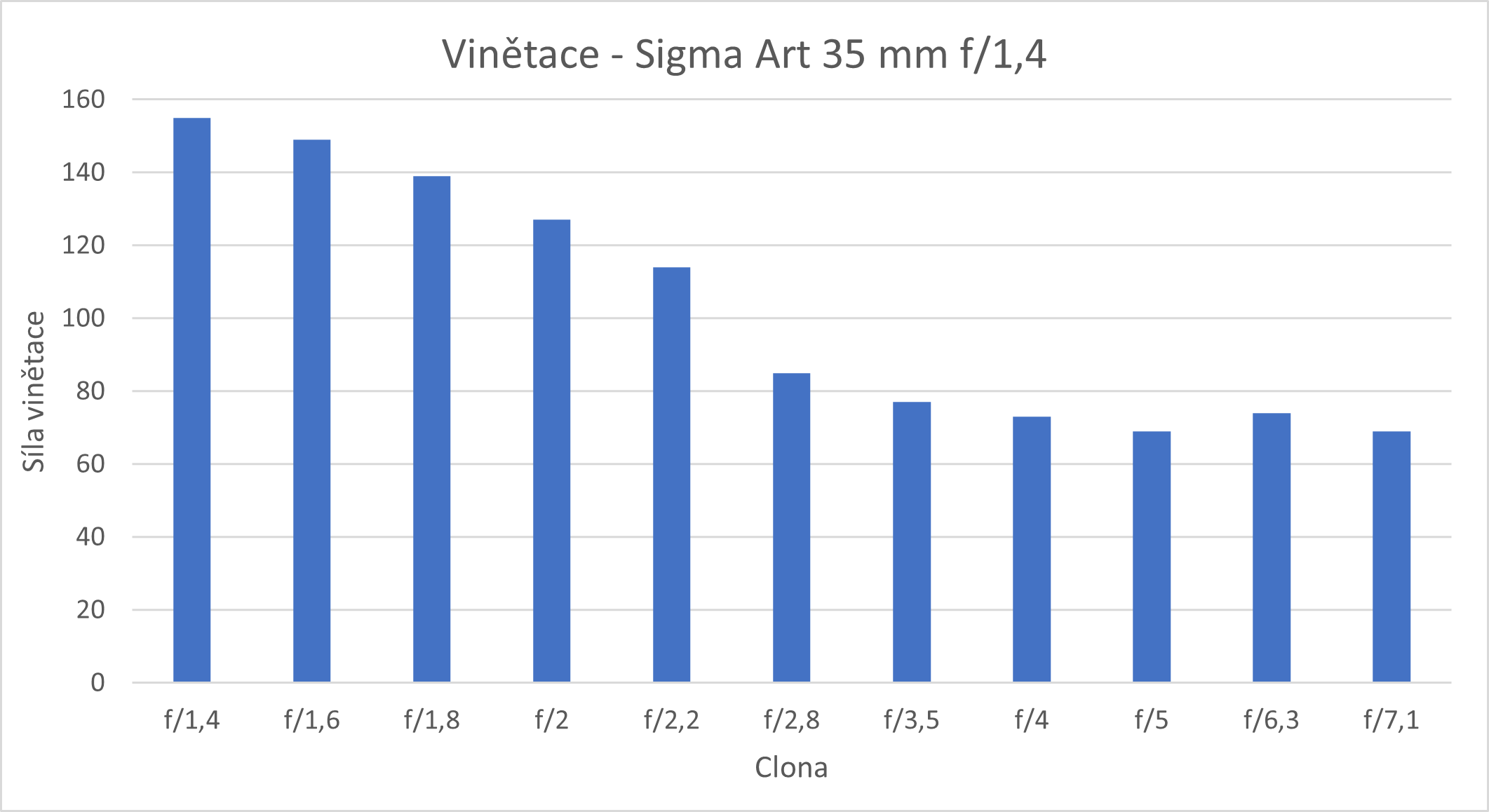Tento velmi světelný objektiv s pevnou ohniskovou vzdálenosti 35 mm má velkou tendenci vinětovat při nejnižších clonových hodnotách. Vinětace klesá se zvyšováním clonového čísla, od hodnoty f/2,8 je vinětace výrazně nižší.