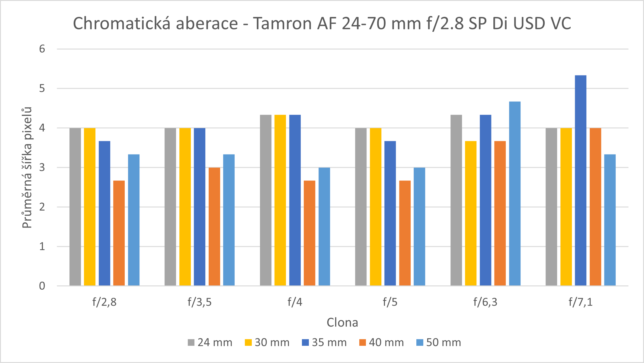 Chromatická aberace je u tohoto objektivu poměrně vysoká. Nejvyšší hodnoty 5,3 px dosahuje při cloně f/7,1 a ohnisku 35 mm. Při ohniscích 40 a 50 mm je aberace výrazně nižší pouze po clonu f/5, poté se opět zvedá. Objektiv však nevykazuje žádné stopy chromatické aberace ve středu snímku na všech ohniscích a všech testovaných clonových číslech.