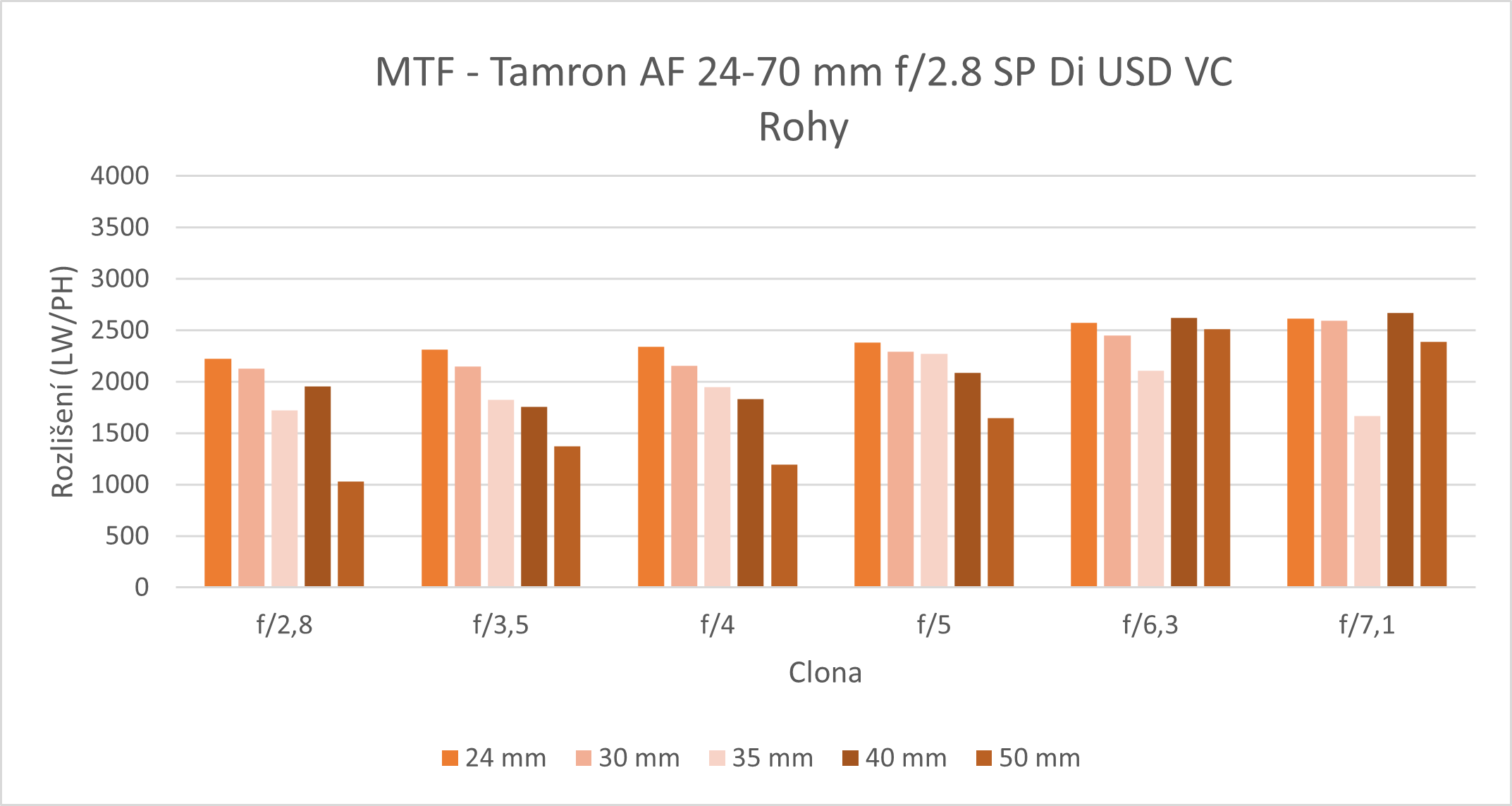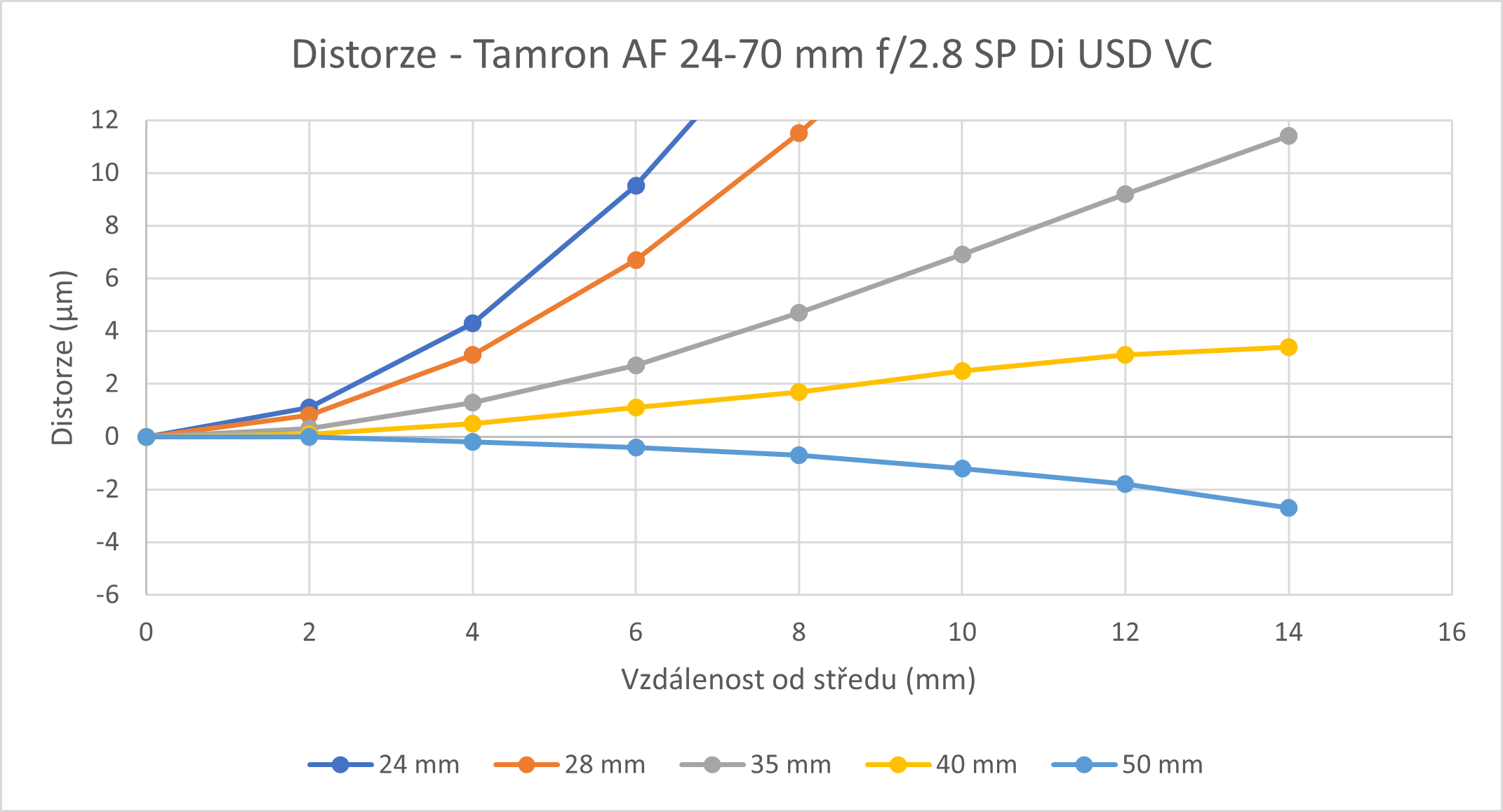 Tento objektiv má charakteristiku distorze nejvíce odchýlenou v závislosti na ohnisku. Podle křivek je patrné, že při použití ohniska 24 mm má distorze extrémně soudkovitý tvar, maximální hodnota je 44 mikrometrů. Podobně tomu je i na ohnisku 28 mm. Nejlepší výsledky, tedy nejrovnější tvar vykazuje objektiv na ohnisku 50 mm, distorze má však poduškovitý tvar.