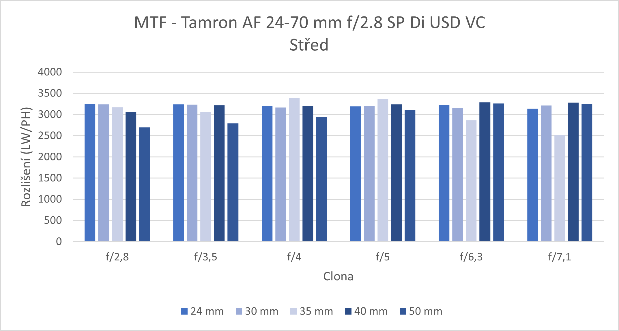 Ostrost tohoto objektivu dosahuje velmi vysokých hodnot na středu snímku při všech ohniscích i clonových číslech. Při použití nižší clony je ostrost nejmenší na ohnisku 50 mm, u vyšších clonových čísel klesá na ohnisku 35 mm. V rozích snímku je objektiv znatelně méně ostrý a více se projevuje změna clony. Se zvyšující se clonou roste i ostrost. Nejnižší hodnoty jsou po clonu f/5 na ohnisku 50 mm, na vyšších clonách pak na ohnisku 35 mm.