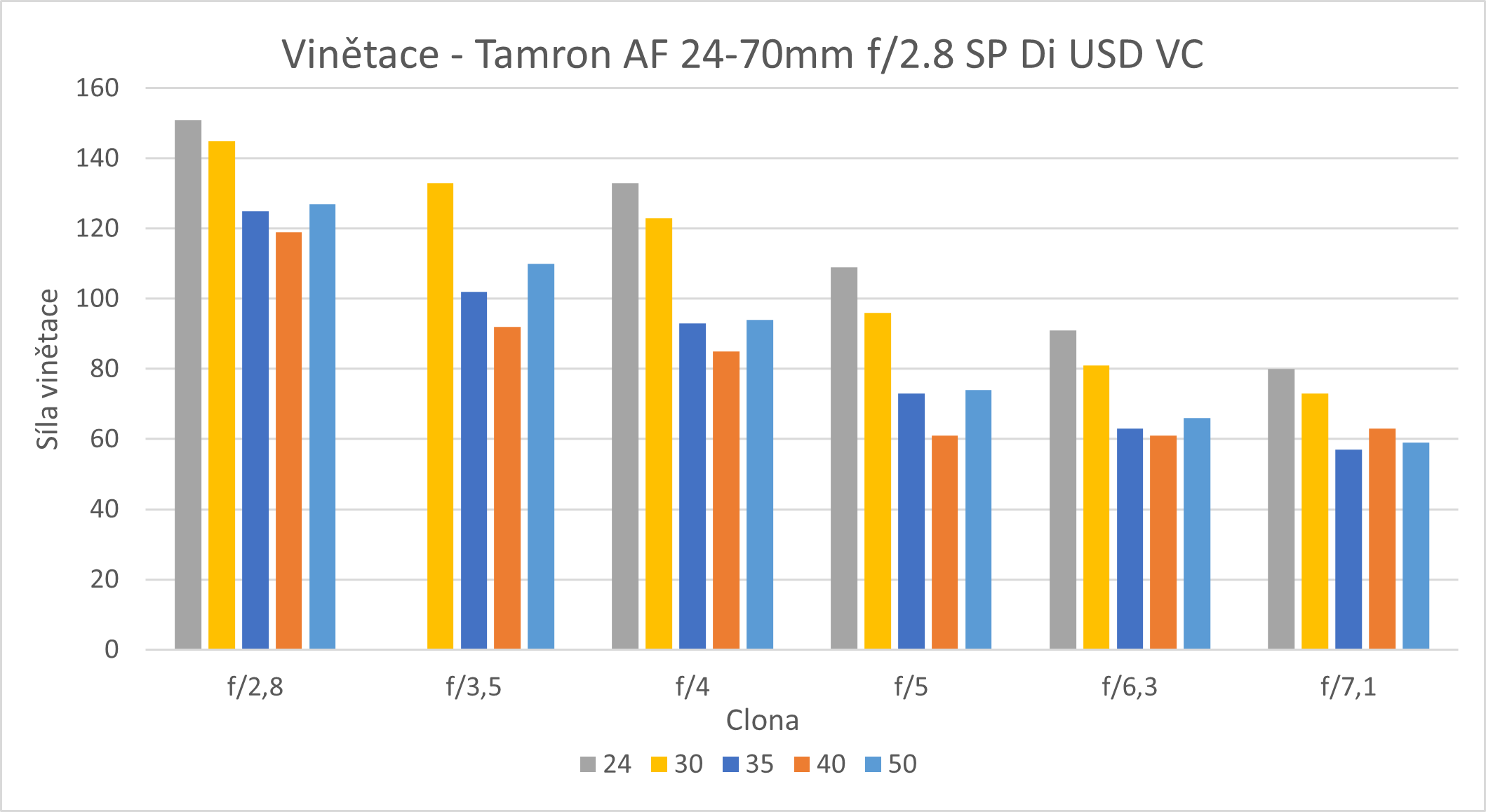 Vinětace na tomto objektivu je velmi silná především na nejširším ohnisku 24 mm, ale i na 30 mm, a to při nastavení clony f/2,8. Slabá síla vinětace je až při cloně 5 a ohnisku 35 mm a užším. Na ohnisku 24 mm při cloně f/3,5 chybí údaj, to je zapříčiněno chybějícím snímkem, který nemohl být nahrazen novým z důvodu vzniku jiného nasvícení plochy a vznikem velké odchylky.